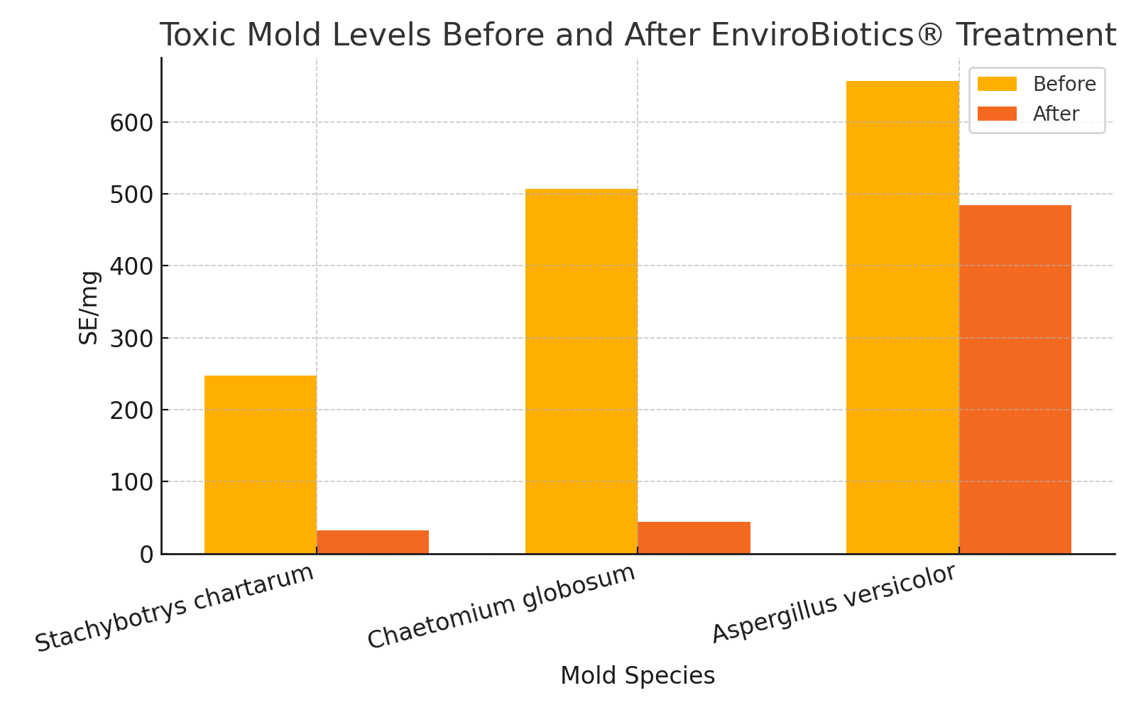 El gráfico muestra de manera clara la diferencia en los niveles de moho tóxico antes y después de la aplicación de EnviroBiotics®.